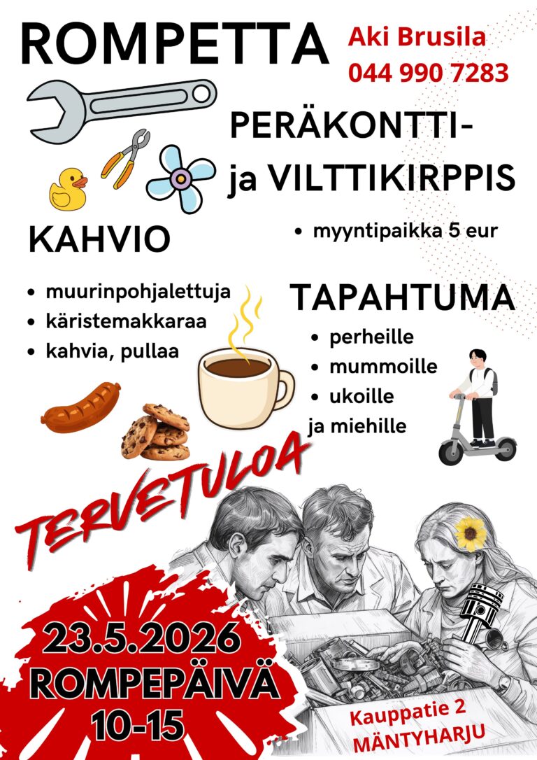 Rompetta, peräkonttikirppis ja vilttikirppis. Vuosittainen tapahtuma, joka mukailee ajatusta myydä rompetta ja tavata samanhenkisiä ihmisiä. Pohjautuu valtakunnallisiin rompepäivä tapahtumiin. Samana päivänä on Mäntyharjun kesän avajaiset. Kylällä monenlaista muutakin tapahtumaa. Pop-up kioskista muurinpohjalettuja, grillimakkaraa, kahvia ja pullaa. Tapahtumaan ei ole pääsymaksua. Myyntipaikat 5€. Paikat 4*6m. (Käteismaksu). Paikkoja nurmikolla ja asfaltilla. Myyntipaikkoja 50 kpl. Paikkavarauksia otetaan jo nyt vastaan. Koko perheen tapahtuma. Lapsille leikkipiste. Maksuton ulko WC.Järjestäjä
