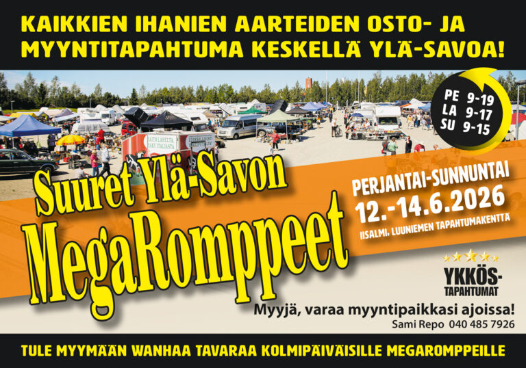 Suuret perinteikkäät Megaromppeet jälleen Iisalmessa 14-16.6.2026!!! Paikalla satoja rompemyyjiä. Tavaraa myynnissä laidasta laitaan. Näytteillä myös vanhoja autoja ja Traktoreita sekä vanhoja esineitä. Myynnissä myös ruokaa. Muunmuassa paistettuja muikkuja, pyttipannua, kebabia, paistettua makkaraa sekä paljon muuta. Kysy edullista myyntipaikkaa tapahtumaan: Sami Repo. puh 0404857926. sami.repo20@gmail.comJärjestäjä