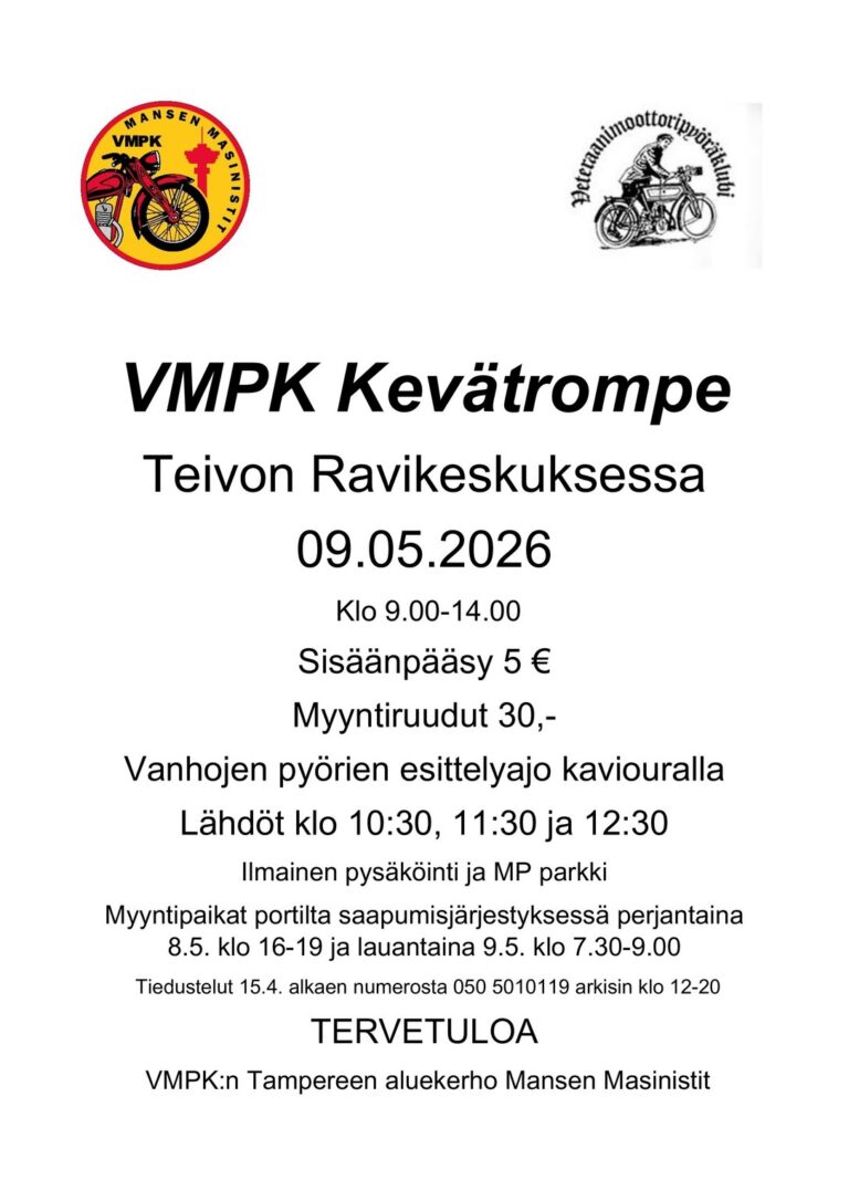 Veteraanimoottoripyöräklubin kevätrompepäivä. Mynnissä mopoja ja moottoripyöriä, niiden osia ja varusteita. Kaviouralla vanhojen moottoripyörien näytösajo. Myyntipaikkoja ulkona ja sisällä.